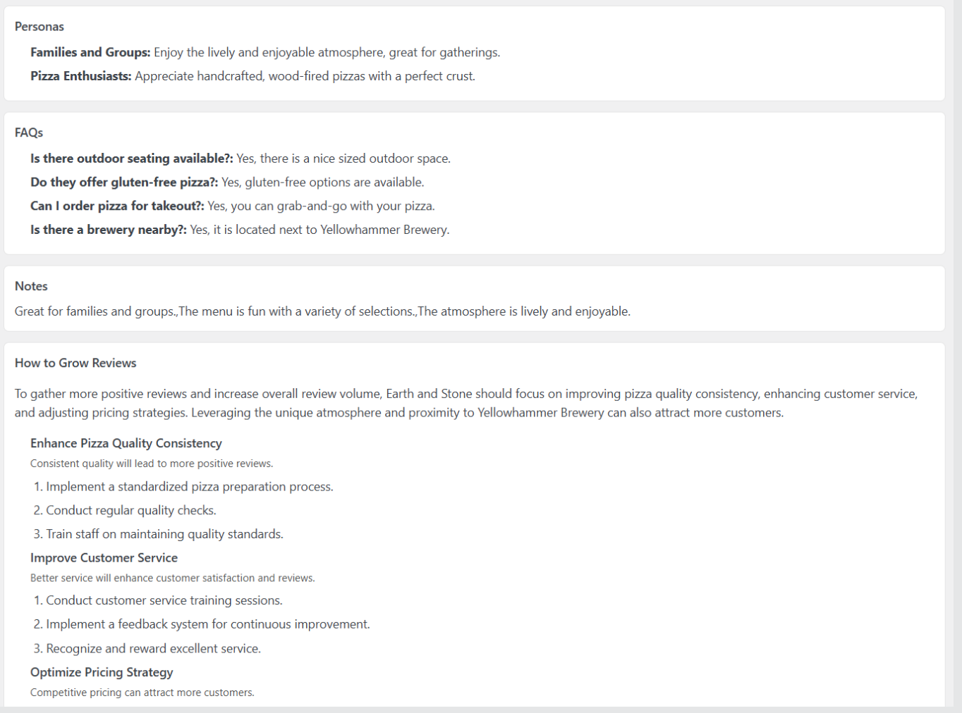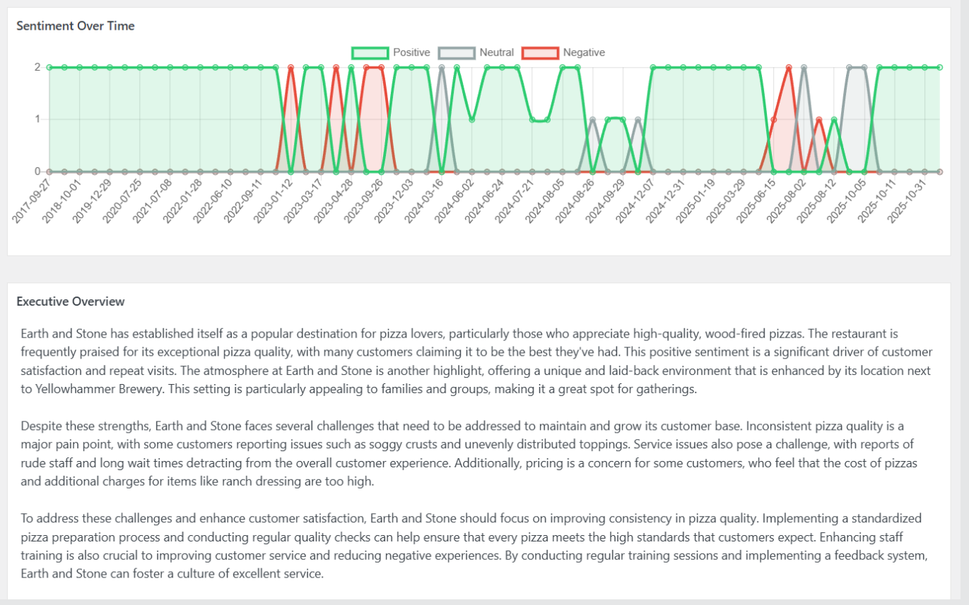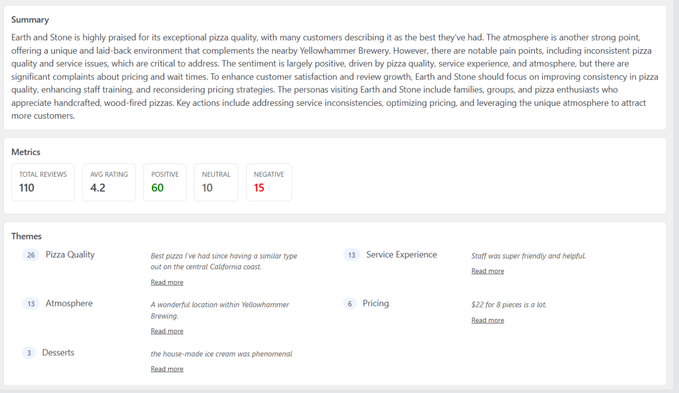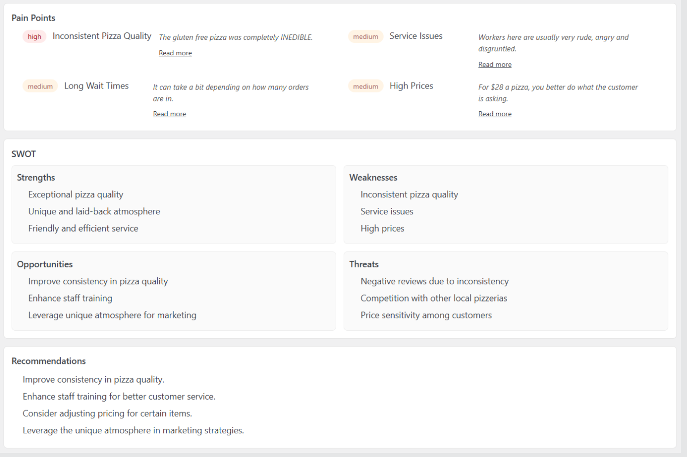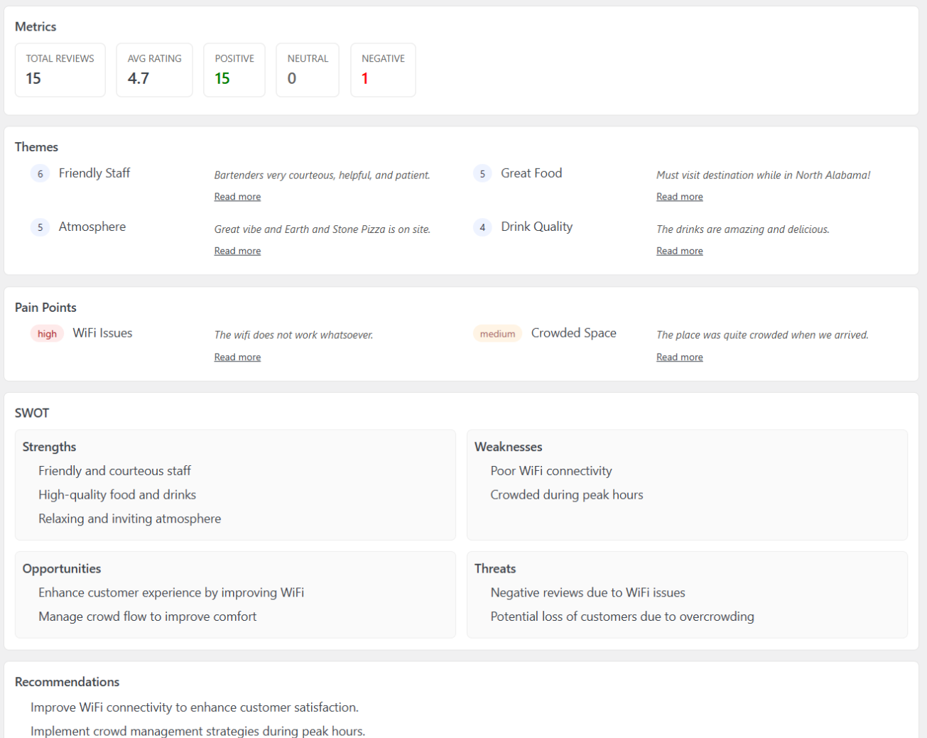 Gain powerful insights into your business — including key Metrics, Themes, Pain Points, SWOT analysis, Recommendations, Customer Personas, Sentiment Trends, and actionable Suggestions for Improvement.